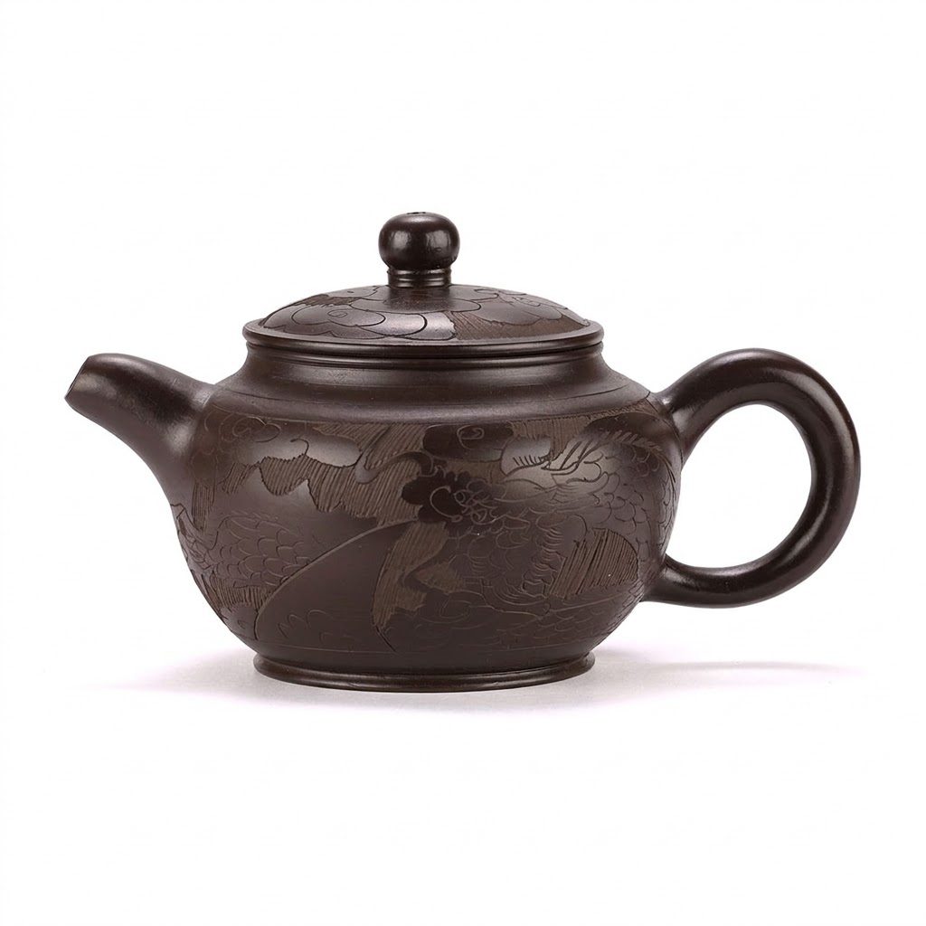 Редкий гость в коллекции — графитовый оттенок глины Цзи Ни встречается нечасто, придавая этому чайнику особую, благородную сдержанность. Форма Фан Гу, «подражающая древности», повторяет линии старинных исинских чайников, где каждая кривая выверена веками использования.