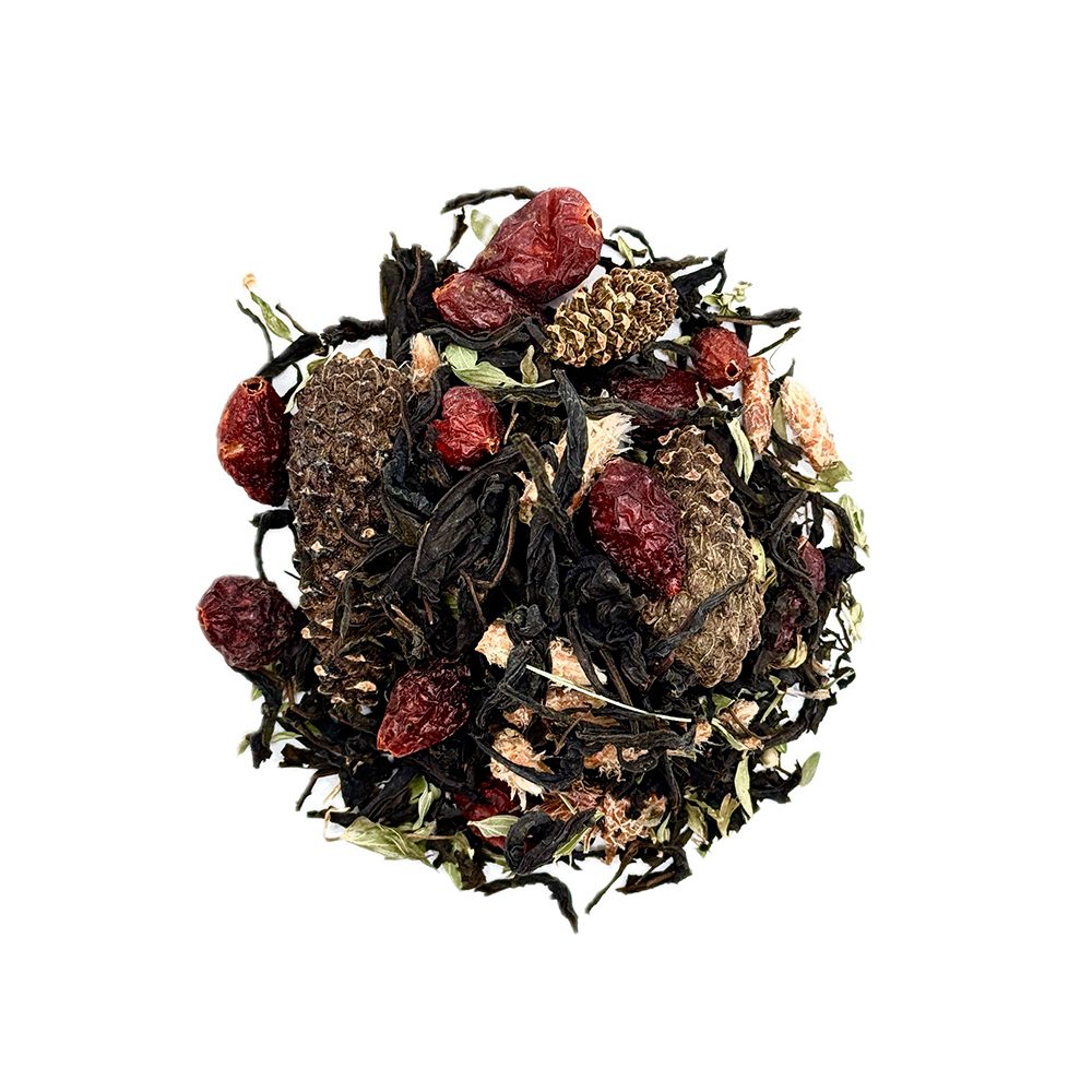 Хвойная симфония в чашке. Молодые сосновые шишки и почки наполняют напиток смолистым теплом, чабрец добавляет пряных нот, шиповник — мягкую кислинку, а иван-чай объединяет композицию в уютный вечерний союз. Идеален для расслабления после прогулки или перед сном.