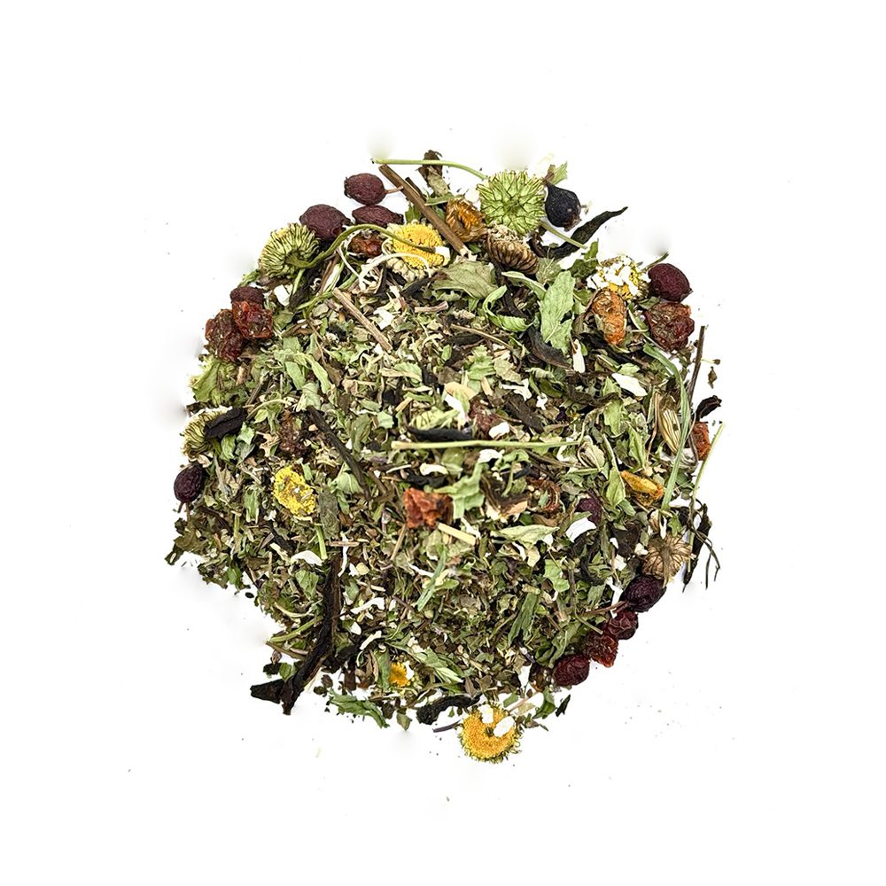 Мягкий успокаивающий сбор для вечернего расслабления и восстановления гармонии. Травяная основа с мятой, ромашкой и мелиссой успокаивает нервную систему, а ягоды облепихи, рябины и боярышника дарят витаминный заряд и лёгкую сладость. Идеален для неспешных чаепитий после бани или напряжённого дня.